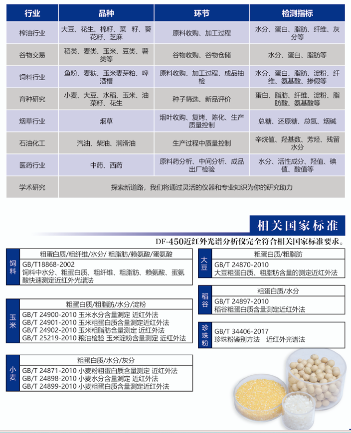 DF-450近红外分光光度计可广泛应用主要用于对粉末、颗粒状及涂层等样品的化学、物理性质作定性定量分析,适用于对农产品、食品、医药等领域的营养成分、水分等化学物理性质的快速无损分析测定。
